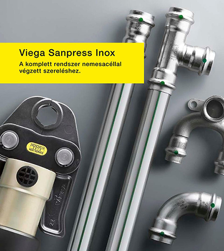 Sanpress Inox komplett rendszer, amely minden ivóvízhez korlátlanul használható. Rozsdamentes nemesacél csövek 15 mm és 108 mm között, ehhez Sanpress Inox présidom a DVGW által minősített SC-Contur-ral (biztonsági kontúr)