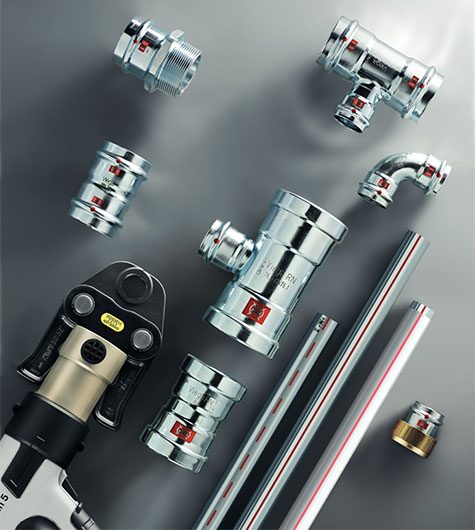 A préselés a tömítőelem előtt és mögött is megtörténik (kettős préselés). Felszállóvezetékek és szinti leágazások vakolat elé és alá történő szereléséhez alkalmas.